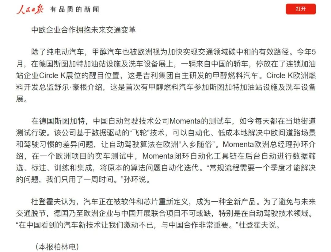 10月17日,《人民日?qǐng)?bào)》國(guó)際版面刊發(fā)的“中國(guó)新能源汽車(chē)積極拓展歐洲市場(chǎng)”一文中,Momenta獨(dú)特的數(shù)據(jù)驅(qū)動(dòng)“飛輪”技術(shù)路徑以及在歐洲市場(chǎng)取得的成績(jī)獲得《人民日?qǐng)?bào)》關(guān)注報(bào)道。
