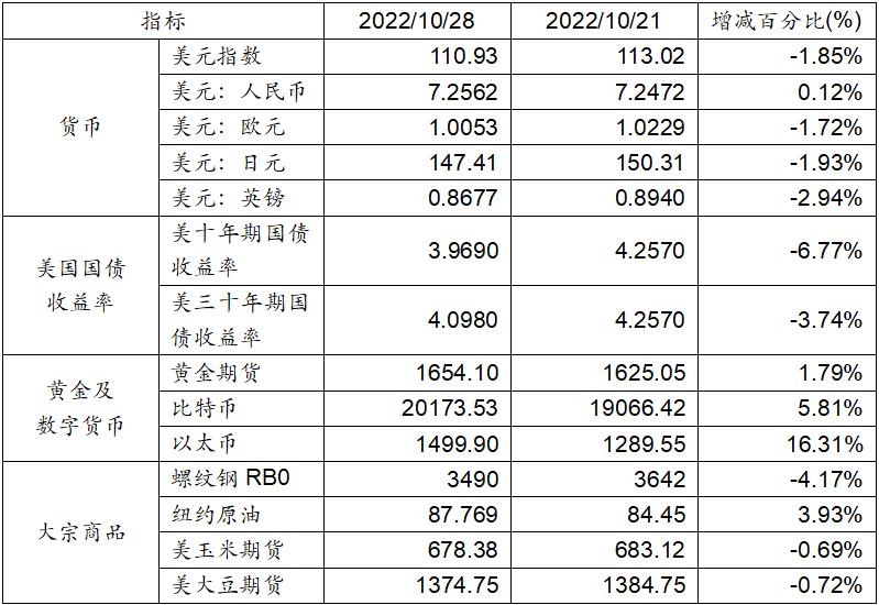 10月21日至10月28日,美元指數下降1.85%,除美元兌人民幣匯率上漲0.12%達到1:7.2562之外,美元對于其他主流貨幣匯率均錄得下降表現。美國十年期及三十年國債收益率也有不同程度的回調。黃金期貨及數字貨幣價格上漲,其中以太幣大漲16.31%。大宗商品當中,除紐約原油價格上漲3.93%,螺紋鋼、美玉米及大豆期貨價格均有所下降。