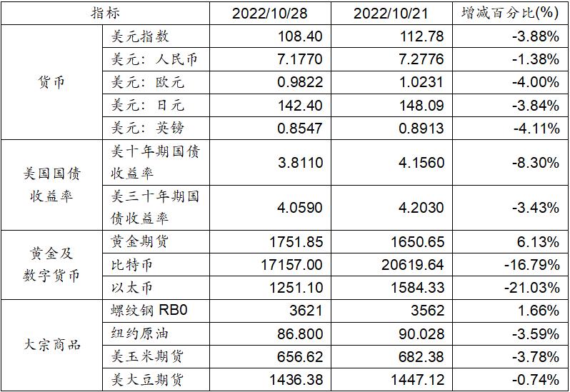 隨著上周四美國發(fā)布顯著好于預(yù)期的通脹數(shù)據(jù),11月04日至11月11日,美元指數(shù)下跌3.88%,美元兌人民幣匯率下跌1.38%達(dá)到1:7.1770。美國十年期及三十年國債收益率分別下跌8.30%和3.43%。黃金期貨價(jià)格上漲6.13%。而加密貨幣市場由于受到FTX危機(jī)影響將面臨數(shù)周的去杠桿化,比特幣和以太幣分別下跌16.79%和21.03%。大宗商品當(dāng)中,除螺紋鋼上漲1.66%之外,紐約原油、美國玉米期貨和大豆期貨價(jià)格均呈現(xiàn)下跌態(tài)勢。