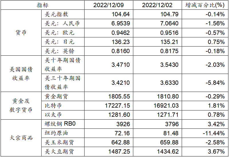 12月02日至12月09日,美元匯率表現(xiàn)依舊表現(xiàn)出來走弱態(tài)勢,美元指數(shù)下跌0.14%,美元兌人民幣匯率下跌1.56%達(dá)到1:6.9539。美國十年期及三十年國債收益率繼續(xù)下跌,分別收跌于3.4710%和3.4210%。黃金期貨價格下跌0.29%。比特幣和以太幣分別上漲1.81%和0.78%。大宗商品當(dāng)中,紐約原油價格大幅度下降11.44%,玉米期貨價格下跌2.58%,螺紋鋼和大豆期貨價格則呈現(xiàn)上漲態(tài)勢。