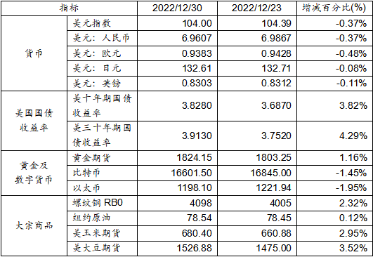 12月23日至12月30日,美元指數(shù)下跌0.37%,美元兌人民幣匯率下跌0.37%達(dá)到1:6.9607。美國(guó)十年期及三十年國(guó)債收益率呈現(xiàn)上升態(tài)勢(shì),分別收漲于3.8280%和3.9130%。黃金期貨價(jià)格上漲1.16%。比特幣下跌1.45%。以太幣下跌1.95%。大宗商品中,紐約原油、玉米期貨、大豆期貨及螺紋鋼價(jià)格均呈現(xiàn)上漲態(tài)勢(shì)。