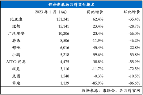 根據乘聯會統計,2023年1月乘用車市場零售達到129.3萬輛,同比下降37.9%,環比下降40.4%,無論同比增速還是環比增速都是本世紀以來的1月最低數據,車市沒有實現1月開門紅,這是符合預期的合理走勢。隨著國際油價下降國內油價進入調整通道、部分新能源車企順應降價/提升用戶權益趨勢、加大終端促銷等舉措均有利于車市回暖。但由于今年春節是本世紀最早的關系,產銷環節工作日同步減少,銷量潛力未得到充足釋放。1月廠商批發銷量144.9萬輛,同比下降32.9%,環比下降34.8%。受新能源市場拉動的影響,部分車企表現分化明顯。1月自主車企批發75.8萬輛,同比下降22%,環比下降41%。主流合資車企批發46.1萬輛,同比下降47%,環比下降32%。豪華車批發23萬輛,同比下降26%,環比下降14%。