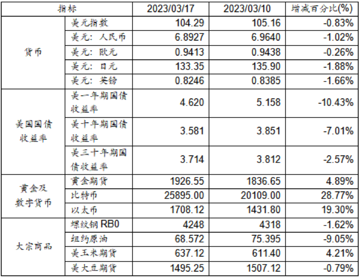 3月10日至3月17日,美元指數(shù)下跌0.83%,美元兌人民幣匯率下跌1.02%達(dá)到1:6.8927。美國一年期、十年期以及三十年其國債收益率均出現(xiàn)下跌。黃金期貨價(jià)格上漲4.89%。比特幣大漲28.77%。以太幣大漲19.30%。大宗商品中,螺紋鋼、紐約原油及大豆期貨價(jià)格均呈現(xiàn)下跌態(tài)勢,而玉米期貨價(jià)格則呈現(xiàn)上漲。