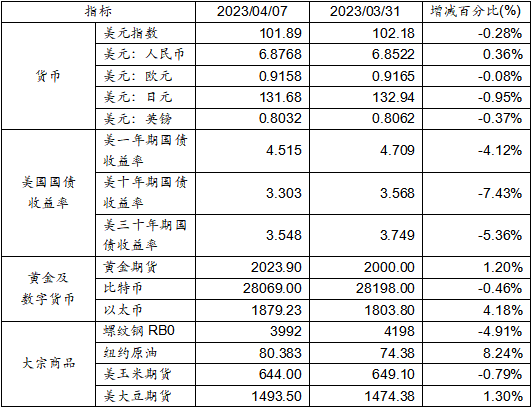 3月31日至4月7日,美元指數下跌0.28%,美元兌人民幣匯率上升0.36%達到1:6.8768。美國一年期、十年期以及三十年其國債收益率均呈現下跌。黃金期貨價格上漲1.20%。比特幣下跌0.46%。以太幣上漲4.18%。大宗商品中,螺紋鋼、玉米期貨呈現下跌,而紐約原油及大豆期貨價格則呈現上漲態勢。