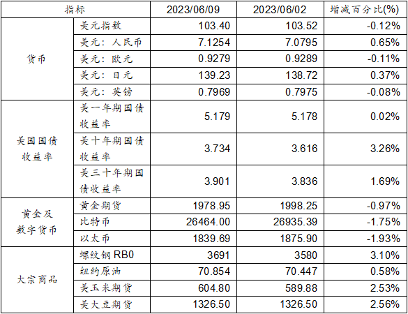 6月2日至6月9日,美元指數下跌0.12%,美元兌人民幣匯率上漲0.65%達到1:7.1254。美國一年期、三年期以及五年期國債收益率均呈現上漲態勢。黃金期貨價格下跌0.97%。比特幣下跌1.75%。以太幣下跌1.93%。大宗商品中,螺紋鋼、紐約原油、大豆期貨及玉米期貨價格均呈現上漲態勢。