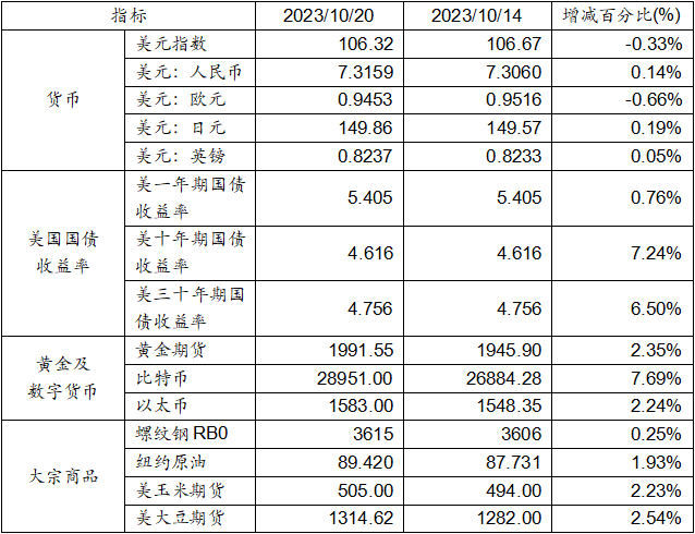 10月14日至10月20日,美元指數(shù)下跌0.33%,美元兌人民幣匯率上升0.14%達到1:7.3159。美國一年期、十年及三十年國債收益率均上漲。黃金期貨價格上漲2.35%。比特幣上漲7.69%。以太幣上漲2.24%。大宗商品中,螺紋鋼、玉米期貨、紐約原油及大豆期貨價格均出現(xiàn)上漲。