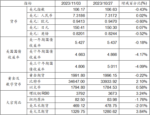 10月27日至11月3日,美元指數(shù)下跌0.43%,美元兌人民幣匯率上升0.02%達(dá)到1:7.3186。美國(guó)一年期、十年及三十年國(guó)債收益率均下跌。黃金期貨價(jià)格下跌0.22%。比特幣上漲2.10%。以太幣上漲0.58%。大宗商品中,螺紋鋼、大豆期貨價(jià)格上漲,而玉米期貨、紐約原油價(jià)格均出現(xiàn)下跌。