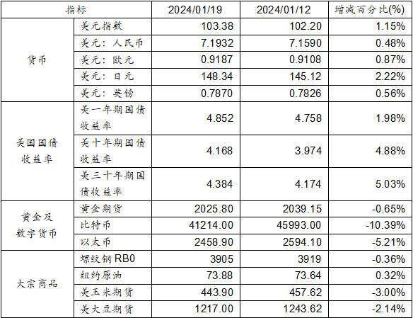 1月12日至1月19日,美元指數(shù)上漲1.15%,美元兌人民幣匯率上漲0.48%達(dá)到1:7.1932。美國(guó)一年期、十年期及三十年其國(guó)債收益率均上漲。黃金期貨價(jià)格下跌0.65%。比特幣下跌10.39%。以太幣下跌5.21%。大宗商品中,紐約原油價(jià)格上漲,而螺紋鋼、玉米期貨及大豆期貨價(jià)格則呈現(xiàn)下跌。