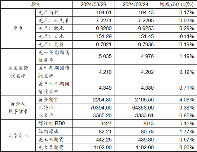 3月24日至3月29日,美元指數(shù)上漲0.17%,美元兌人民幣匯率下跌0.03%達(dá)到1:7.2271。美國(guó)一年期及十年期國(guó)債收率上漲,而三十年期國(guó)債收益率則有所下跌。黃金期貨價(jià)格上漲4.08%。比特幣上漲9.38%。以太幣上漲6.95%。大宗商品中,螺紋鋼價(jià)格下跌,而紐約原油及玉米期貨價(jià)格呈現(xiàn)上漲態(tài)勢(shì)。