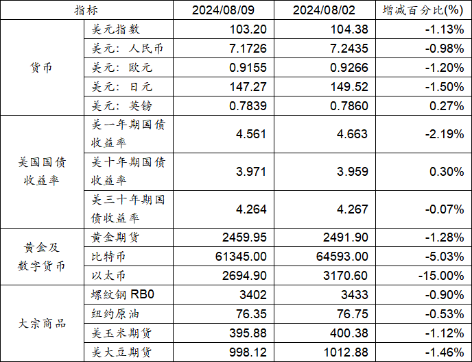 8月2日至8月9日,美元指數下跌1.13%,美元兌人民幣匯率下跌0.98%至1:7.1726。美國一年期及三十年期國債收益率呈現下跌態勢,而十年期國債收益率上漲。黃金期貨價格下跌1.28%。比特幣下跌5.03%。以太幣下跌15.00%。大宗商品中,玉米期貨、大豆期貨、螺紋鋼及紐約原油價格均呈現下跌態勢。