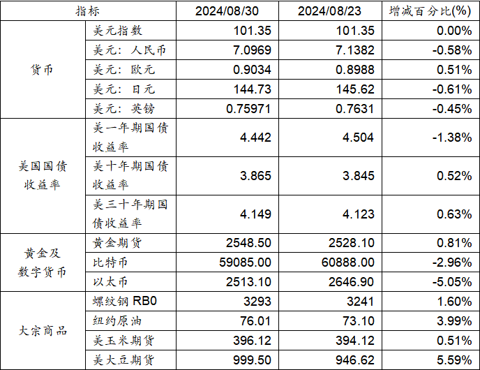 8月23日至8月30日,美元指數(shù)不變,美元兌人民幣匯率下跌0.58%至1:7.0969。美國一年期國債收益率下跌,而十年期及三十年期國債收益率呈現(xiàn)上漲態(tài)勢。黃金期貨價格上漲0.81%。比特幣下跌2.96%。以太幣下跌5.05%。大宗商品中螺紋鋼、玉米期貨、大豆期貨及紐約原油價格均呈現(xiàn)上漲態(tài)勢。
