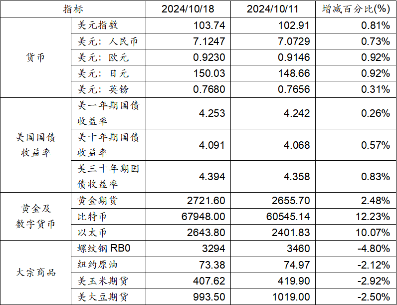 10月11日至10月18日,美元指數上漲0.81%,美元兌人民幣匯率上漲0.73%至1:7.1247。美國一年期國債、十年期及三十年期國債收益率均呈現上漲態勢。黃金期貨價格上漲2.48%。比特幣大漲12.23%。以太幣大漲10.07%。大宗商品中螺紋鋼、紐約原油、玉米期貨及大豆期貨價格均下跌。