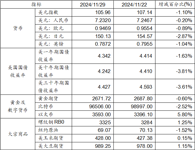 11月22日至11月29日,美元指數(shù)下跌1.10%,美元兌人民幣匯率下跌0.20%。美國一年期、十年期及三十年期國債收益率均出現(xiàn)下跌態(tài)勢(shì)。黃金期貨價(jià)格下跌0.60%。比特幣下跌2.52%。以太幣上漲5.80%。大宗商品中紐約原油價(jià)格下跌,而螺紋鋼、玉米期貨及大豆期貨價(jià)格則呈現(xiàn)上漲態(tài)勢(shì)。