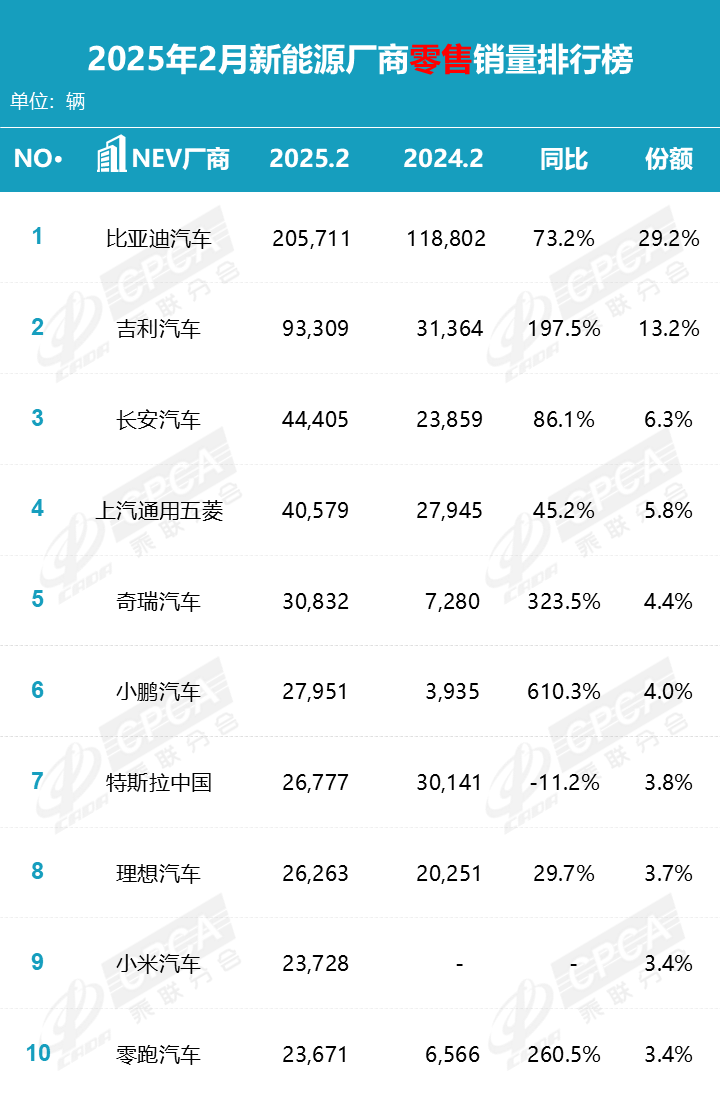 2025年1月,新能源汽車產(chǎn)銷分別完成101.5萬輛和94.4萬輛,同比分別增長29%和29.4%,新能源汽車新車銷量達到汽車新車總銷量的38.9%。2月,新能源汽車產(chǎn)銷分別完成88.8萬輛和89.2萬輛,同比分別增長91.5%和87.1%,新能源汽車新車銷量達到汽車新車總銷量的41.9%。1-2月,新能源汽車產(chǎn)銷分別完成190.3萬輛和183.5萬輛,同比均增長52%,新能源汽車新車銷量達到汽車新車總銷量的40.3%。