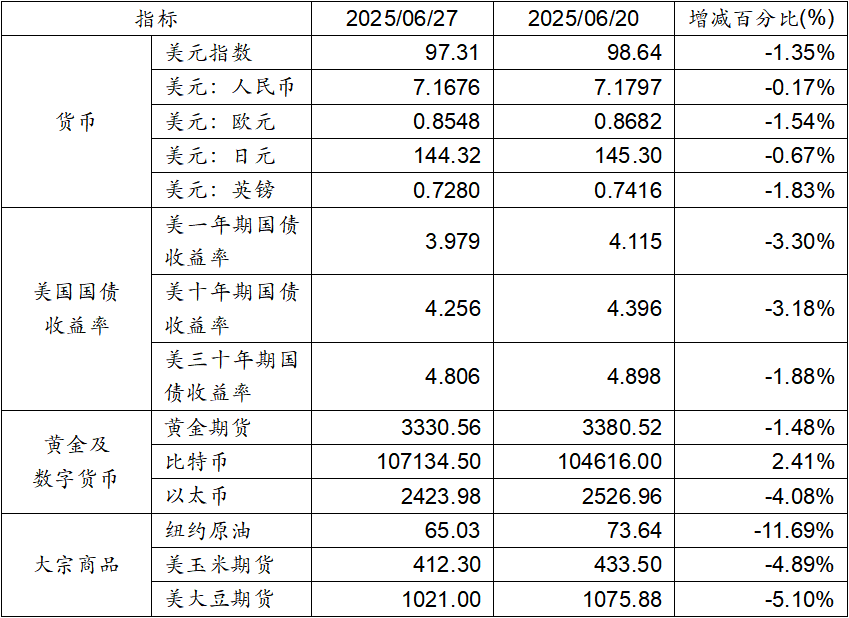 6月20日至6月27日,美元指數下跌1.35%,美元兌人民幣匯率下跌0.17%。美國一年期十年期及三十年期國債收益率均呈現下跌態勢。黃金期貨價格下跌1.48%。比特幣上漲2.41%。以太幣下跌4.08%。大宗商品中紐約原油、玉米期貨及大豆期貨價格均呈現下跌態勢。