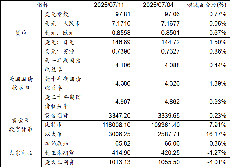 7月4日至7月11日,美元指數上漲0.77%,美元兌人民幣匯率上漲0.05%。美國一年期十年期及三十年期國債收益率均呈現上漲態勢。黃金期貨價格上漲0.23%。比特幣上漲7.91%。以太幣上漲16.17%。大宗商品中紐約原油、玉米期貨及大豆期貨價格均呈現下降態勢。