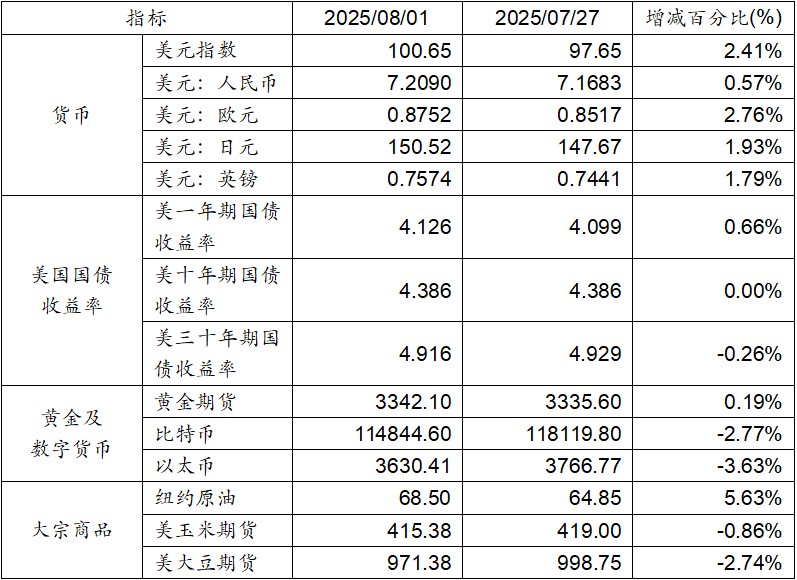 7月27日至8月1日,美元指數(shù)上漲2.41%,美元兌人民幣匯率上漲0.57%。美國一年期國債收益率上漲,十年期國債收益率持平,而三十年期國債收益率則呈現(xiàn)下跌態(tài)勢。黃金期貨價(jià)格上漲0.19%。比特幣下跌2.77%。以太幣下跌3.63%。大宗商品中紐約原油價(jià)格上漲,玉米期貨及大豆期貨價(jià)格則呈現(xiàn)下跌態(tài)勢。