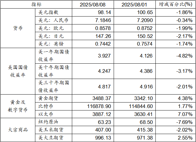 8月1日至8月7日,美元指數下跌1.86%,美元兌人民幣匯率下跌0.34%。美國一年期、十年期及三十年期國債收益率均呈現下跌態勢。黃金期貨價格上漲4.38%。比特幣上漲1.77%。以太幣上漲7.07%。大宗商品紐約原油、玉米期貨及大豆期貨價格均呈現下跌態勢。