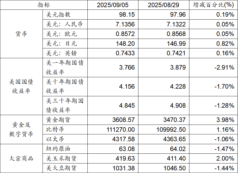 8月29日至9月5日,美元指數上漲0.19%,美元兌人民幣匯率上漲0.05%。美國一年期、十年期及三十年期國債收益率均呈現下降態勢。黃金期貨價格上漲3.98%。比特幣上漲1.16%。以太幣下跌1.06%。大宗商品玉米期貨價格上漲,而紐約原油及大豆期貨價格則呈現下跌態勢。