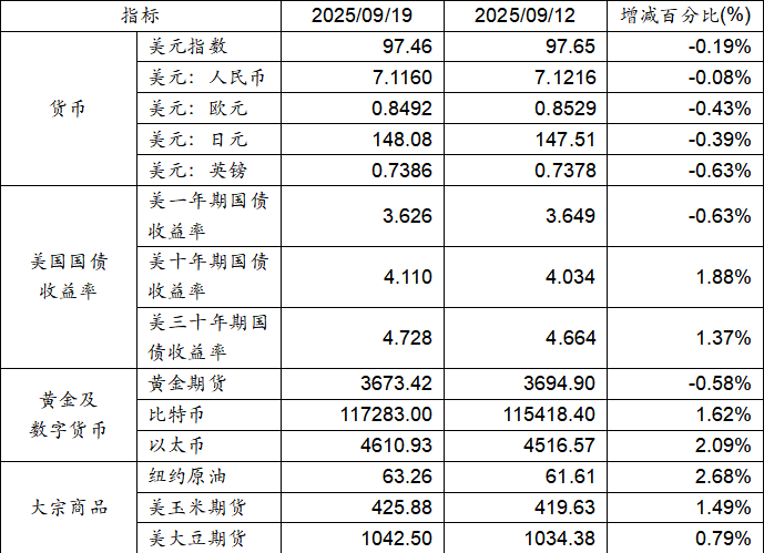 9月12日至9月19日,美元指數(shù)下跌0.19%,美元兌人民幣匯率下跌0.08%。美國一年期國債收益率下跌,而十年期及三十年期國債收益率則呈現(xiàn)上漲態(tài)勢。黃金期貨價(jià)格下跌0.58%。比特幣上漲1.62%。以太幣上漲2.09%。大宗商品中紐約原油、大豆期貨及玉米期貨價(jià)格均呈現(xiàn)上漲態(tài)勢。