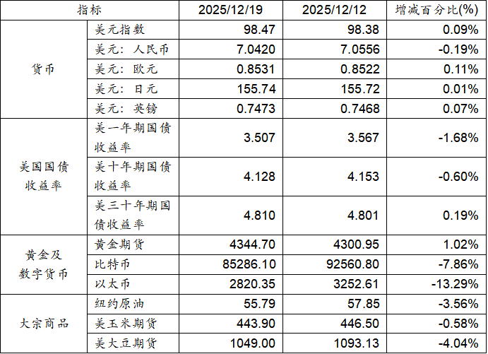 12月05日至12月12日,美元指數(shù)上漲0.09%,美元兌人民幣匯率下跌0.19%。美國(guó)一年期及十年期國(guó)債收益率下跌,而三十年期國(guó)債收益率則出現(xiàn)上漲態(tài)勢(shì)。黃金期貨價(jià)格上漲1.02%。比特幣下跌7.86%。以太下跌13.29%。大宗商品中紐約原油、玉米期貨及大豆期貨價(jià)格均呈現(xiàn)下跌態(tài)勢(shì)。