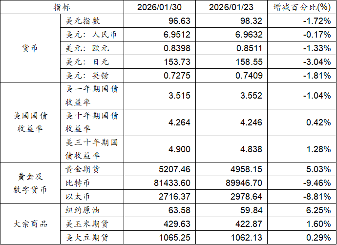 1月23至1月30日,美元指數下跌1.72%,美元兌人民幣匯率下跌0.17%。美國十年期國債收益率下跌,而十年期及三十年期國債收益率則實現上漲。黃金期貨價格上漲5.03%。比特幣下跌9.46%。以太幣下跌8.81%。大宗商品中紐約原油、玉米期貨及大豆期貨價格均呈現上升態勢。