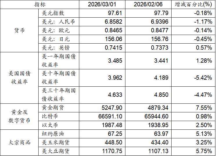 2月6日至3月1日,美元指數下跌0.18%,美元兌人民幣匯率下跌1.17%。美國一年期國債收益率上漲,而十年期及三十年期國債收益率出現下跌。黃金期貨價格上漲7.55%。比特幣上漲0.98%。以太幣上漲2.50%。大宗商品中紐約原油、玉米期貨及大豆期貨價格均呈現上升態勢。