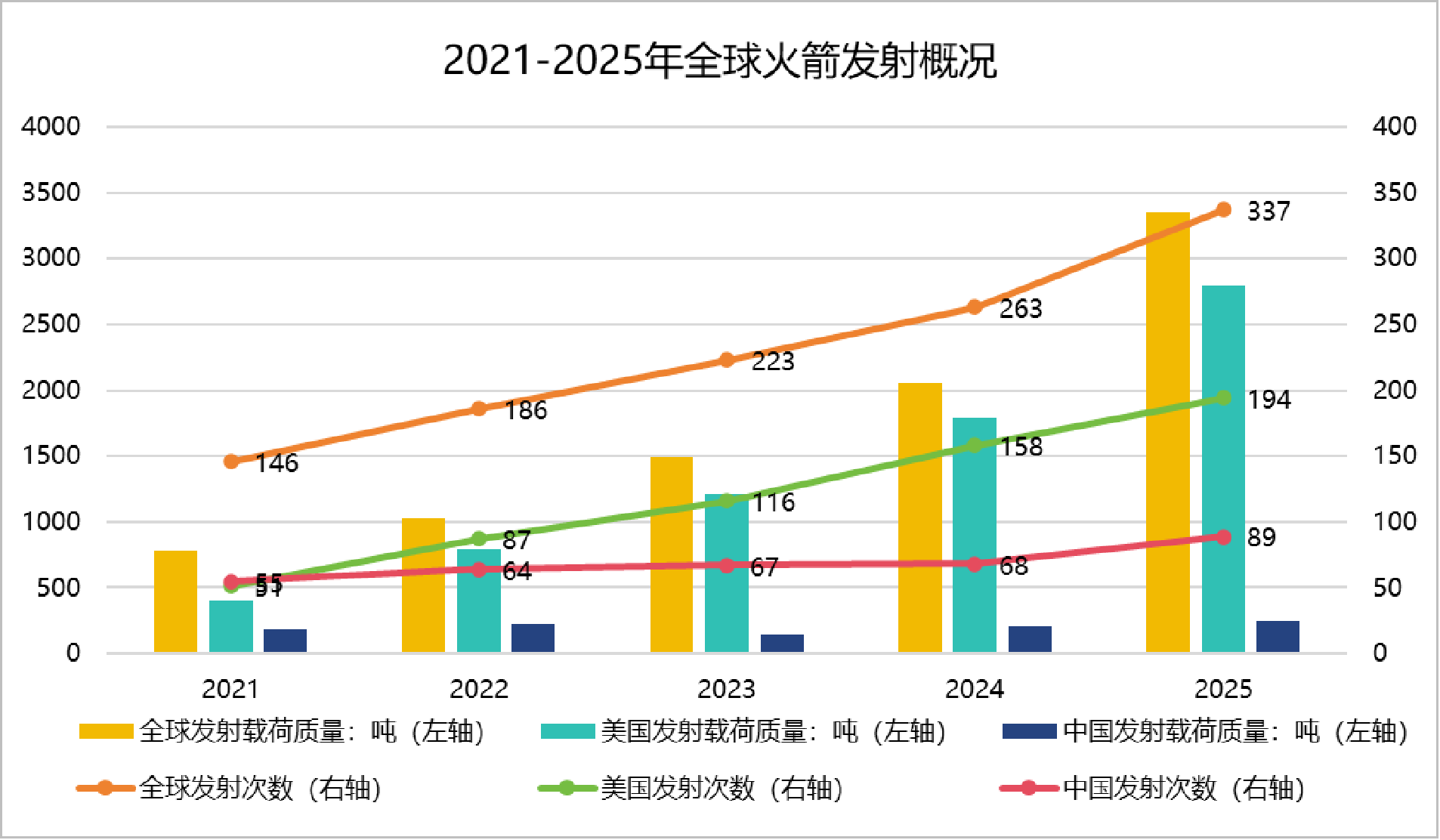 上圖可以看出過去五年全球火箭發射次數和發射載荷質量都在保持快速增長,其中美國貢獻了全球絕大部分的發射和增量市場,中國的發射次數和發射載荷質量整體保持穩定,但和美國的差距反而越來越大。以2025年為例,中國全年發射載荷重量僅為大約250噸,而美國這一數字是接近2800噸,相差10多倍。